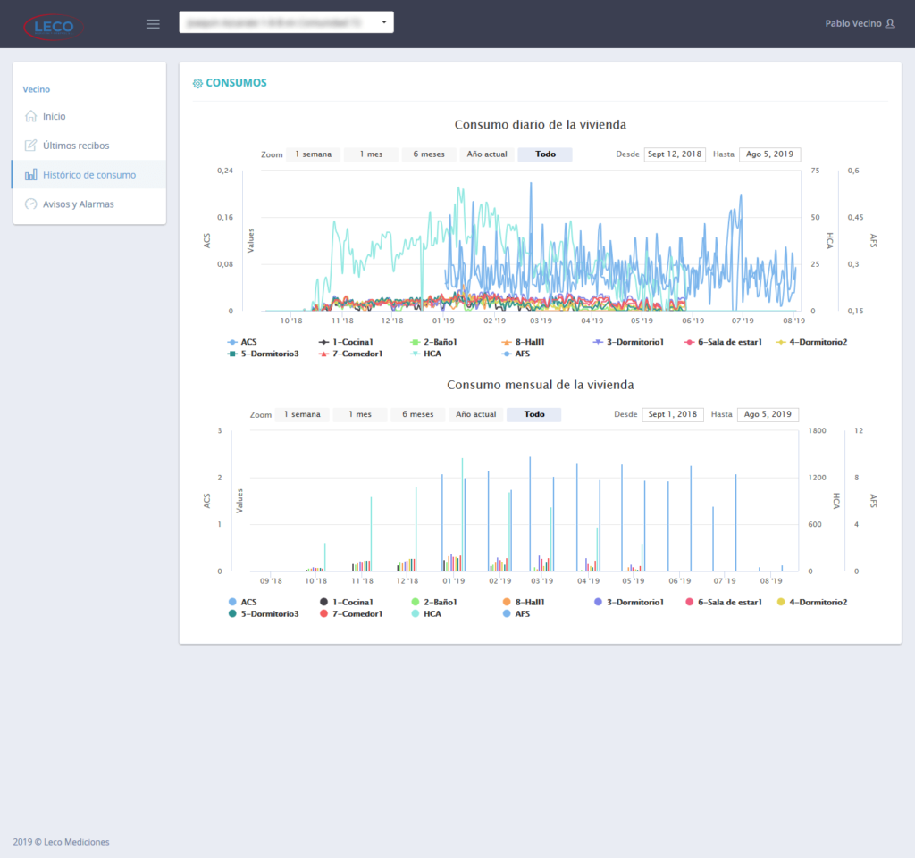 Histórico de consumos: Podrá analizar el consumo de su vivienda por contadores e incluso por estancias de manera anual, semestral, semanal o diario